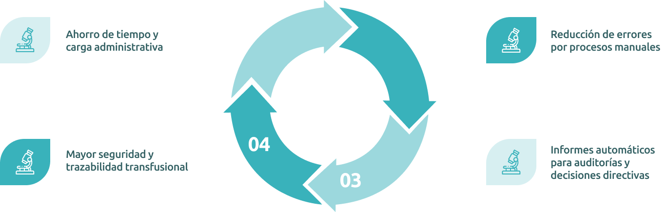 Controltotal desde la donación hasta la transfusión. Optimiza flujos de trabajo,reduce errores humanos y fortalece la trazabilidad.